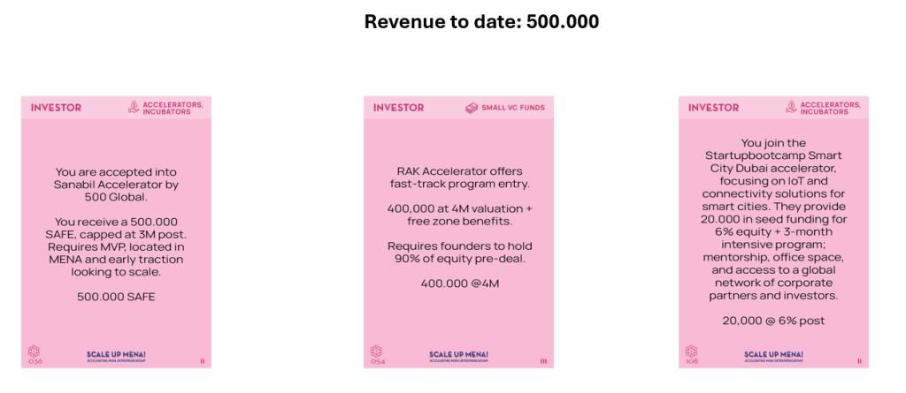 Post angels, local accelerators are next. Sanabil 500, RAK or Startup Bootcamp are all great programs. Yet, in our example, also offering very different terms. Who would you go with?