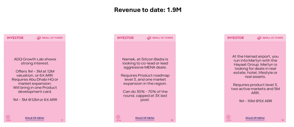 Revenue tips the magic $1M mark. Things are looking up. VCs come around for early coffee. Note, they all want various forms of market traction and progress. Let’s just assume you already have the Dubai Market Expansion card here.