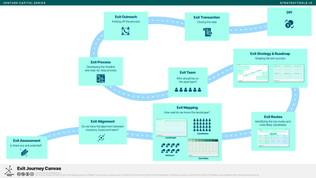 It is a canvas perfectly suited for exit teams, Head of DPI or anyone tasked with creating exits and liquidity in an existing portfolio. Note, the Exit Journey Canvas is not designed for working on exit paths pre-investment. For that purpose we recommend the GP Exit Canvas.