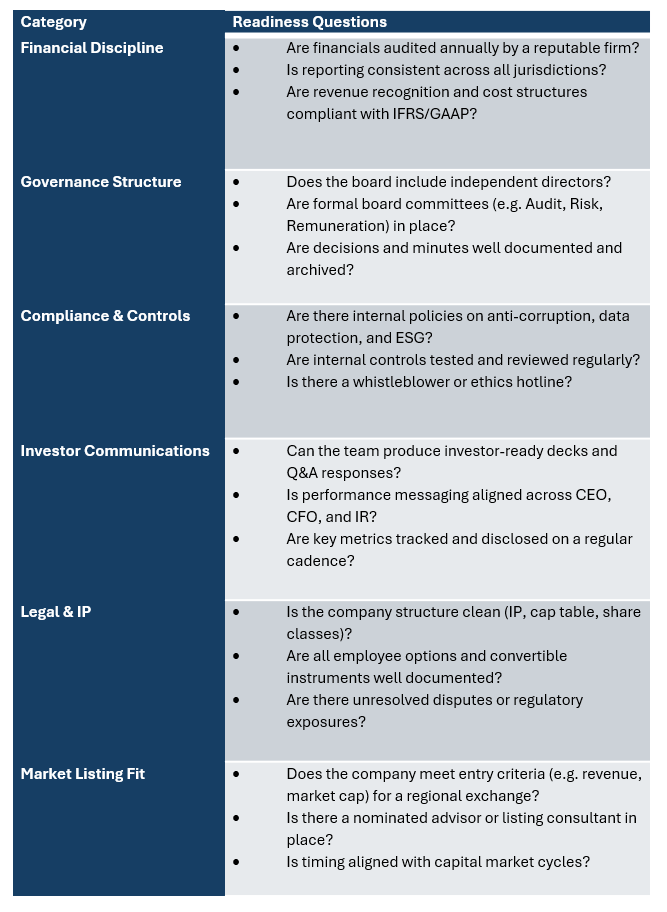 The Canvas: Evaluate IPO readiness even if a public listing is not the chosen path to institutionalize governance, signal maturity, and preserve the option for future IPOs or higher-value M&A.