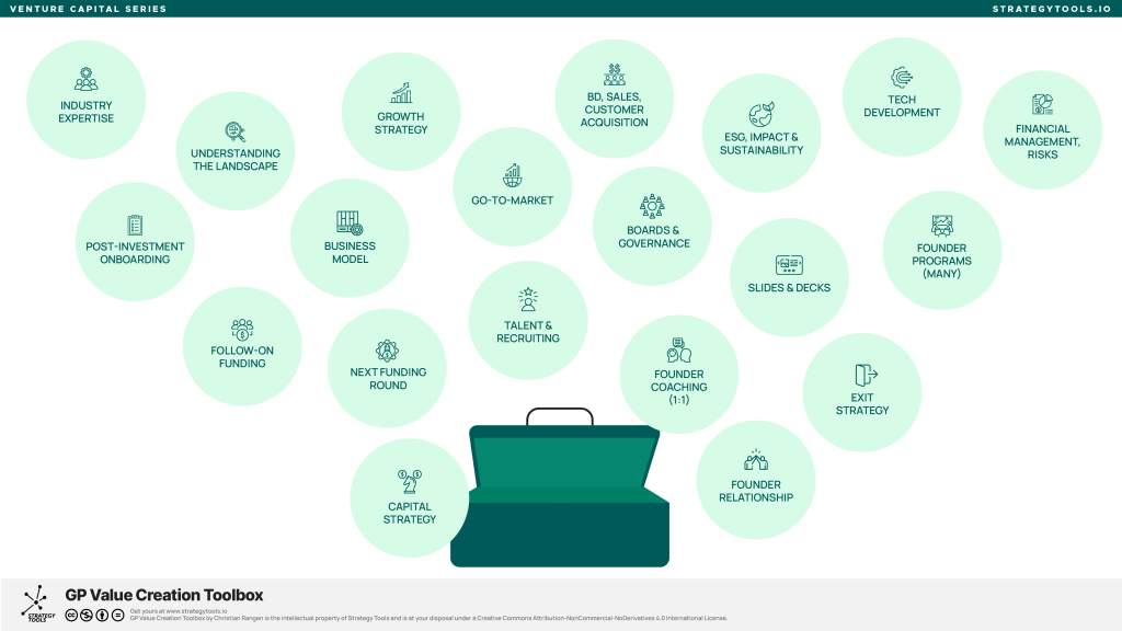 What emerged from that series of interviews was a profound insight into the multiple, different methods of value creation a venture capital investor can bring to the table. Both from a professional, structured way and a personal capability way, a VC investor has a rich toolbox to work with.