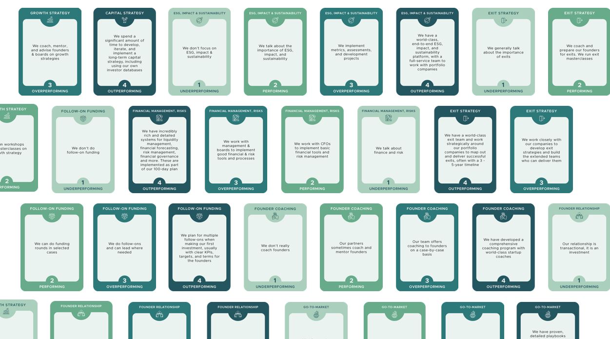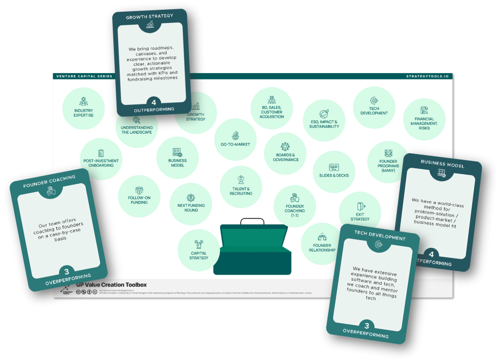 Following those interviews we wanted to capture this insight, leading to the creation of the GP Value Creation canvases. To make the topic even more tangible for managers, we developed the GP Value Creation Cards, a stack of 80 cards, shaped to help VCs reflect, discuss and evolve their own value creation strategies.
