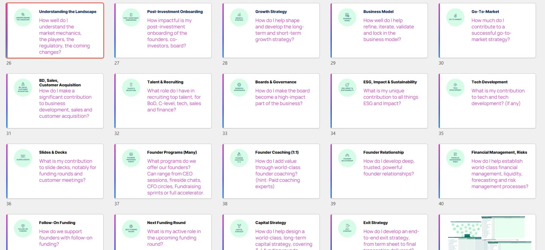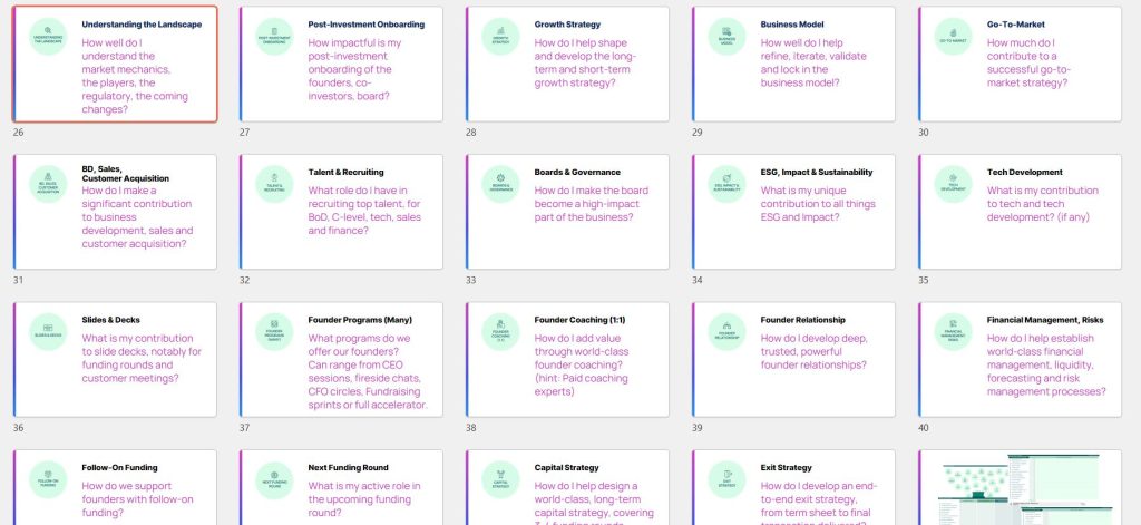 The background of the module was a series of ongoing interviews I had with fund managers across markets. We discussed how they approached post-investment, value creation with their portfolio companies. From PE funds in Africa, VC funds in Asia and early-stage investors, we talked about platform teams, emerging managers, small funds and large funds, and how they all have different approaches to venture capital value creation.
