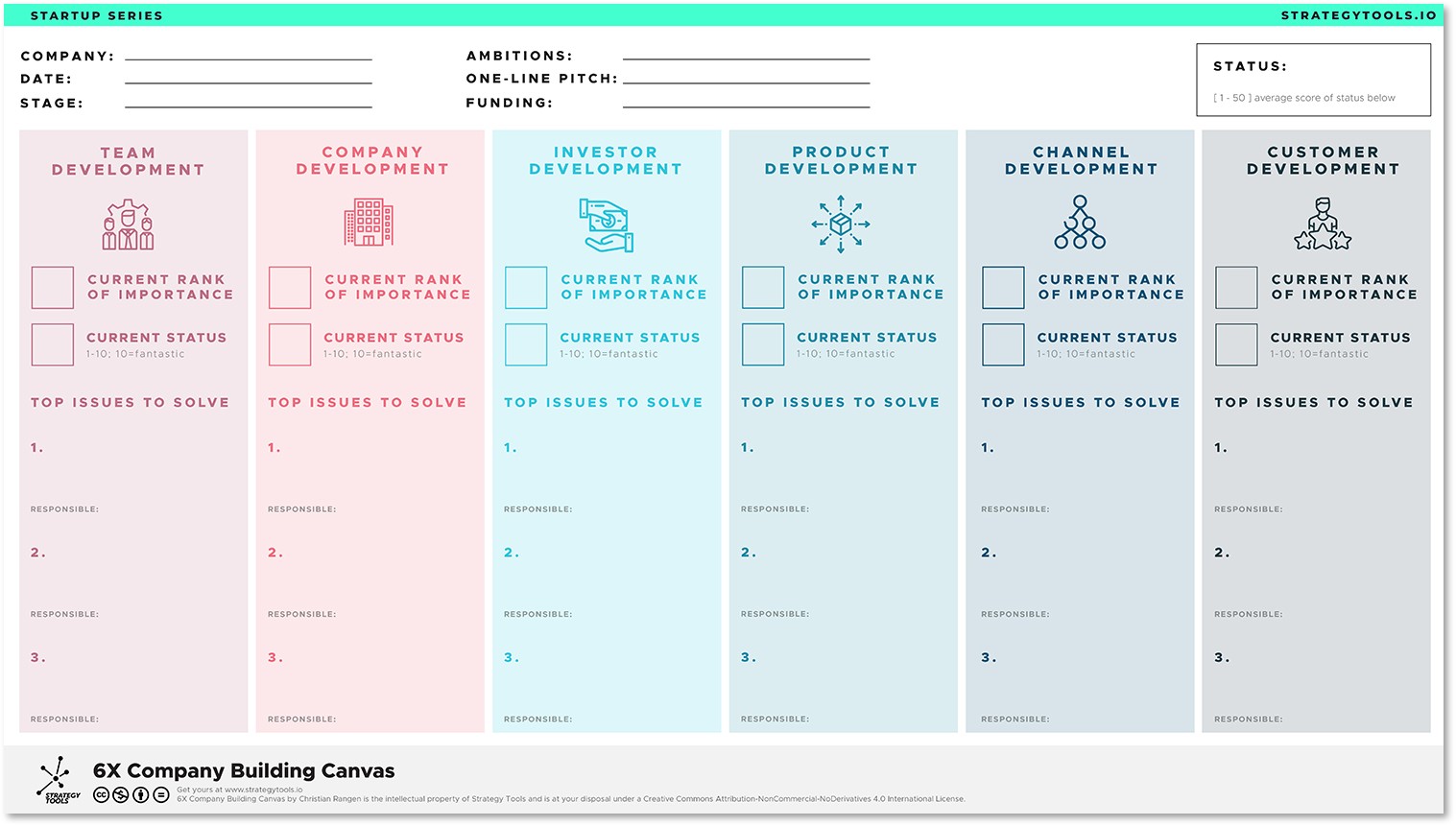 As a leader of a startup, it is often hard to get everyone aligned in a quick and visual way on how to build the company. The 6X Company Building Canvas solves this problem. It provides a shared understanding of the startup’s growth issues and helps identify what key areas you should focus on. It is also a great way of reporting your weekly progress to the team and the board.